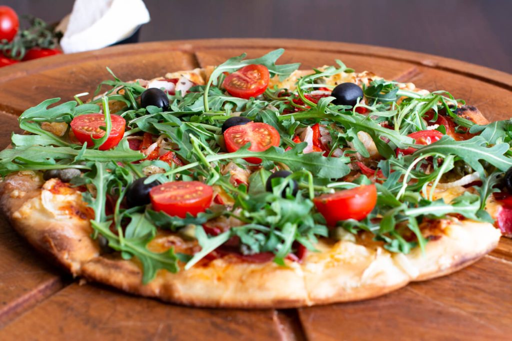 Garnish with fresh arugula and drizzle with balsamic glaze before serving.