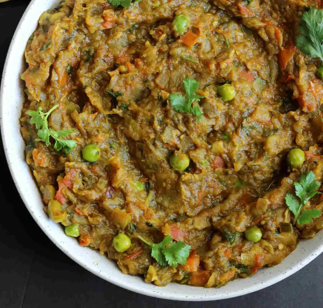 Prepare the Bharta: Heat oil in a pan over medium heat. Add cumin seeds and let them sizzle. Add the chopped onions and sauté until they turn golden brown. Mix in the minced garlic, ginger, and green chilies. Cook until the raw smell disappears. Add the chopped tomatoes, turmeric, coriander powder, red chili powder, and salt. Cook until the tomatoes are soft and the oil starts to separate.