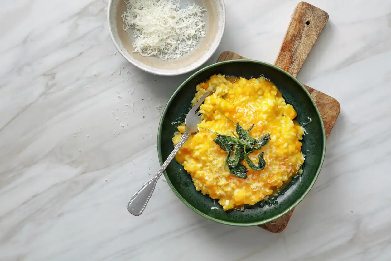 Serve Serve the risotto warm, garnished with toasted pine nuts, the remaining sage, and extra Parmesan cheese.